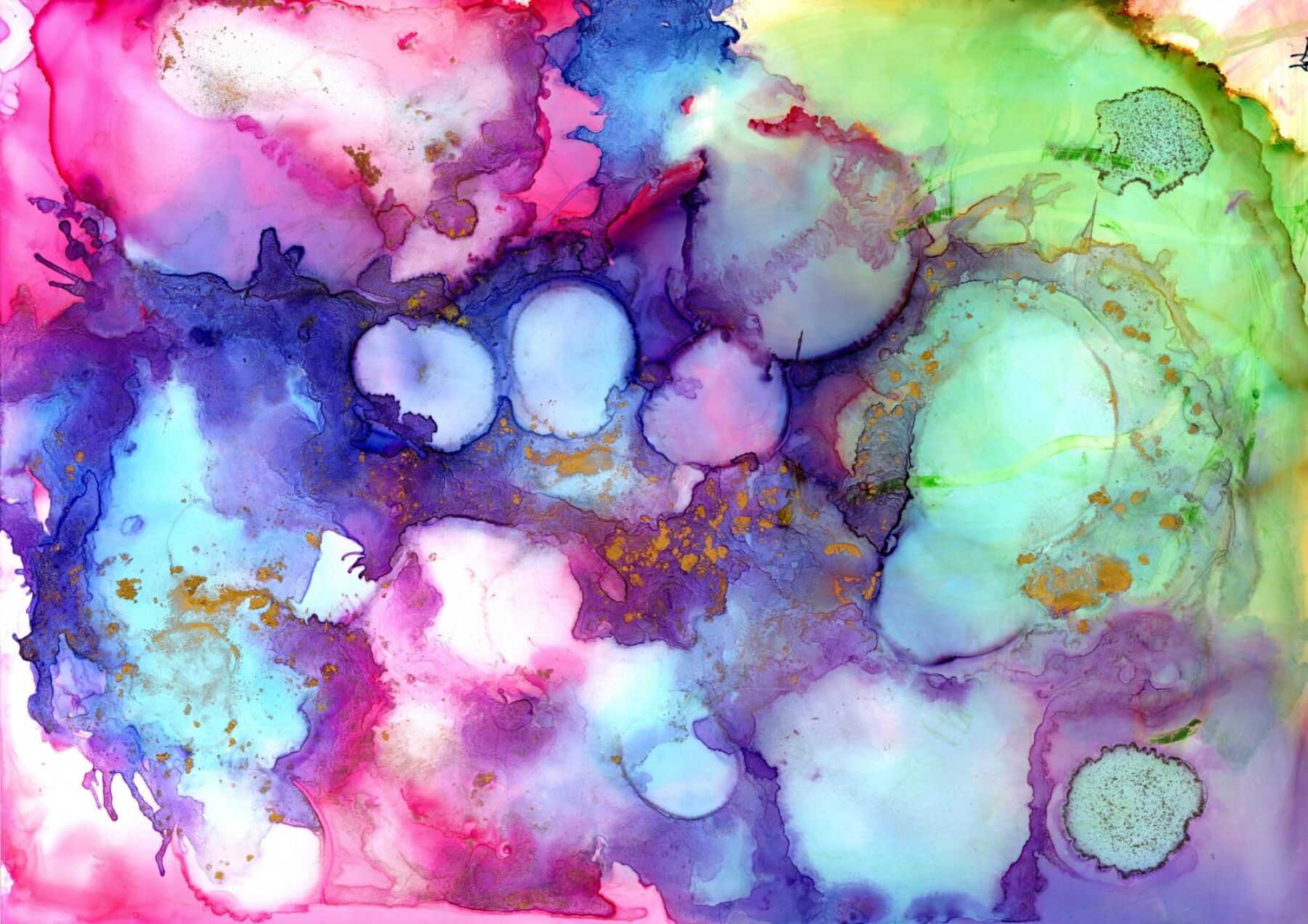 This piece feels alive with colour. Swirls of pink, green, blue, and purple flow into one another, broken up by bursts of gold that seem to sparkle on the surface. The round shapes scattered through the painting bring to mind bubbles, or maybe distant planets, floating in a shifting sky.