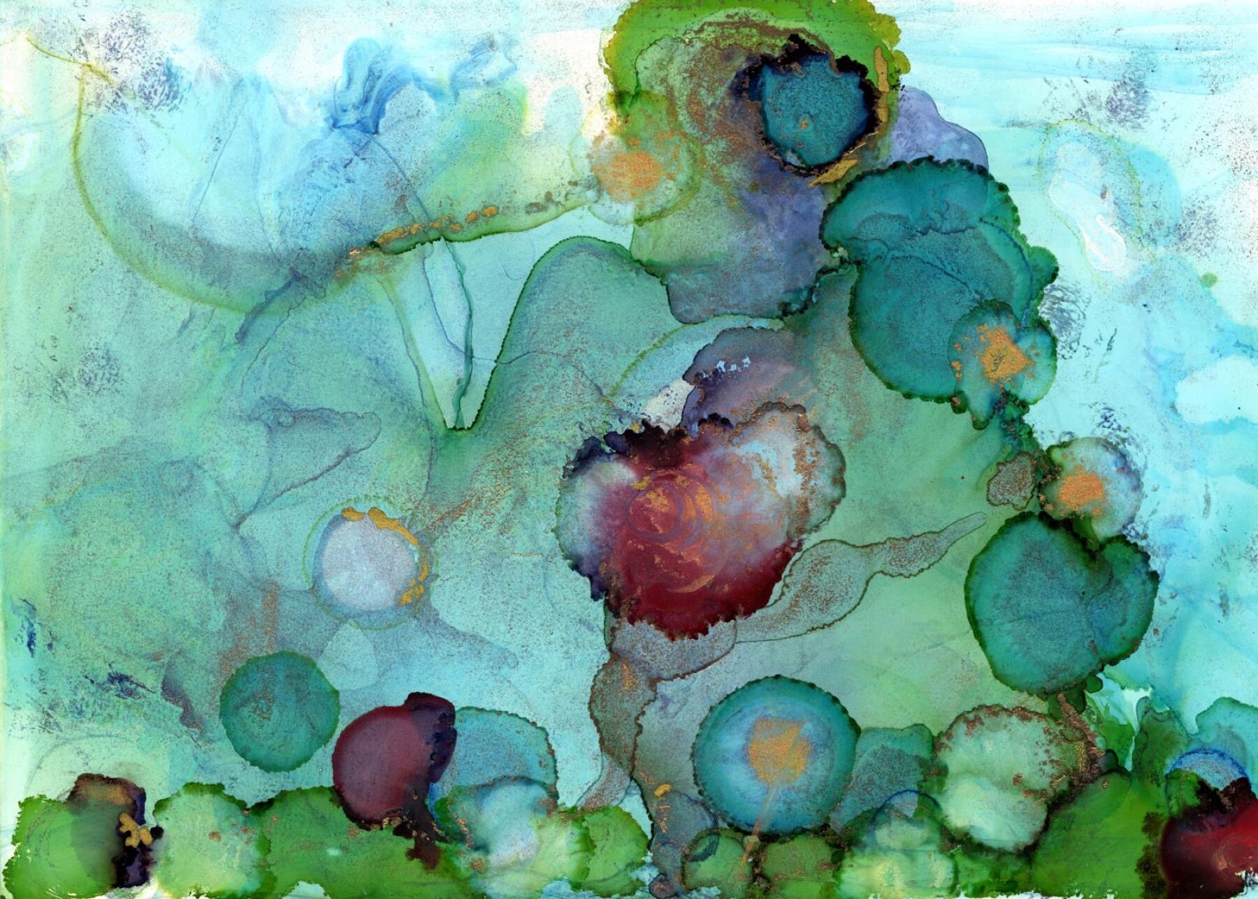 This piece has the feeling of a garden seen through a dream. Soft greens and blues spread across the page like hills or water, while deeper reds and purples rise up almost like flowers. The gold touches catch the light, giving the whole scene a quiet shimmer.